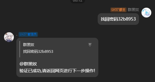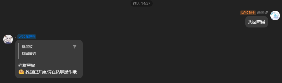 允许用户通过和机器人私聊的方式找回密码,不过需要通过在群内发送关键词,机器人创建临时会话的方式