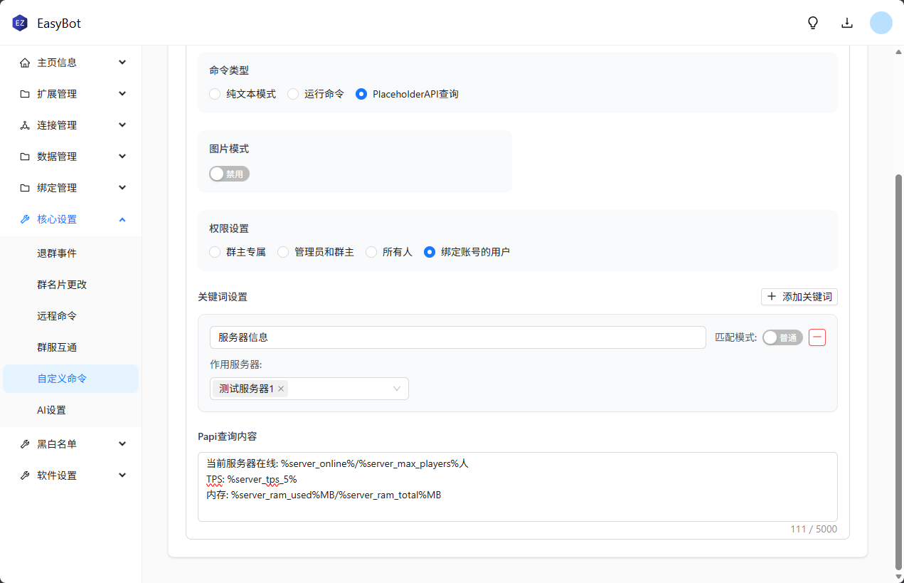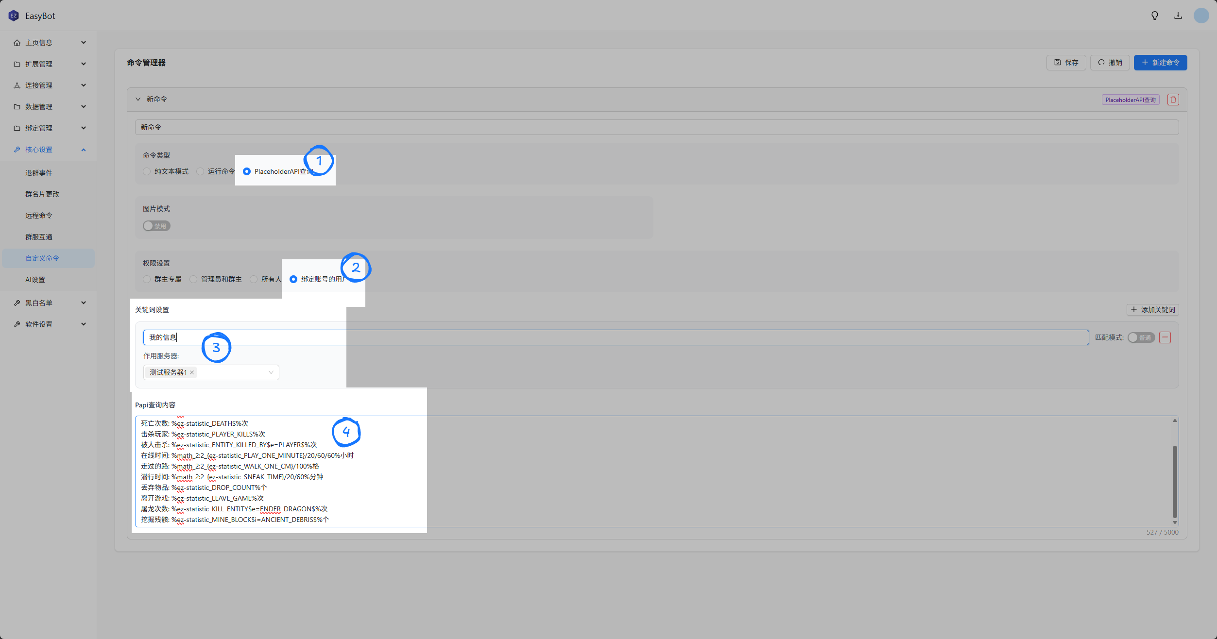 查询玩家信息(要指定玩家)的操作,必须将命令权限设置为绑定账号的用户, 否则查询不到任何数据!