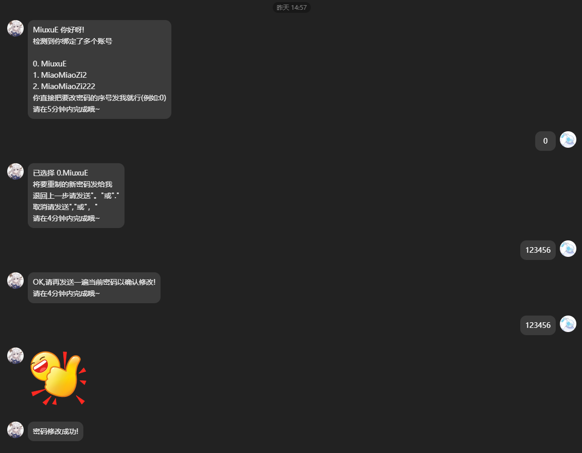 允许用户通过和机器人私聊的方式找回密码,不过需要通过在群内发送关键词,机器人创建临时会话的方式