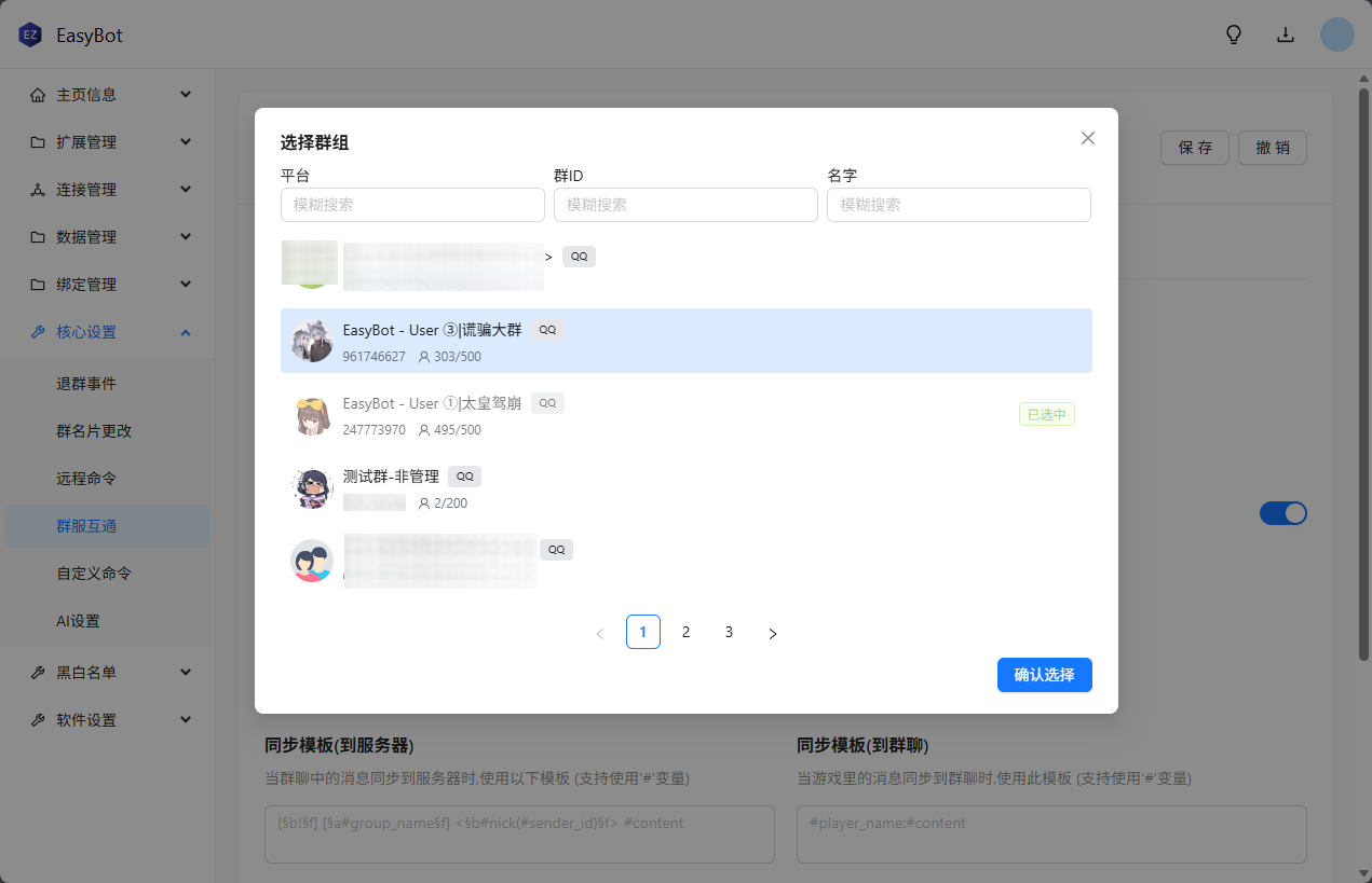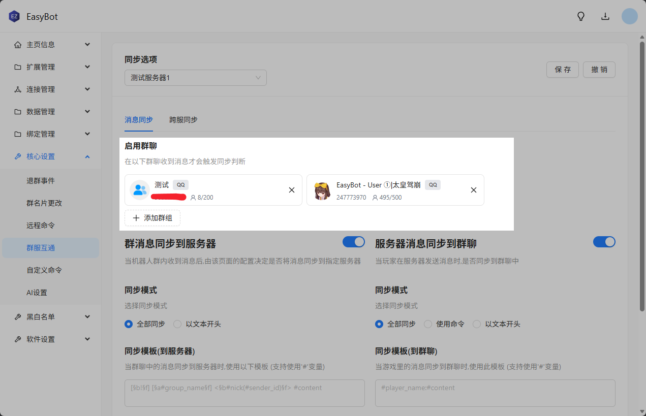 功能文档消息同步介绍版本:2.0.0本页总览介绍介绍消息同步允许将用户的平台消息同步到游戏,或将游戏消息同步到平台。 消息同步启用群聊 启用群聊你可以启用多个群聊, 当消息同步触发时会转发到目标群聊。