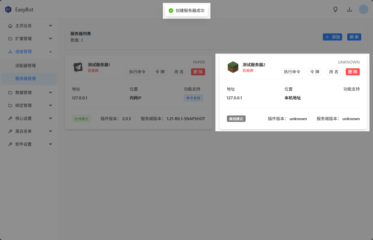得益于 MCDR 的特性, EasyBot 可以兼容原版服务端, 同时也可以在 Forge/Fabric 等 Mod 服务端上运行。